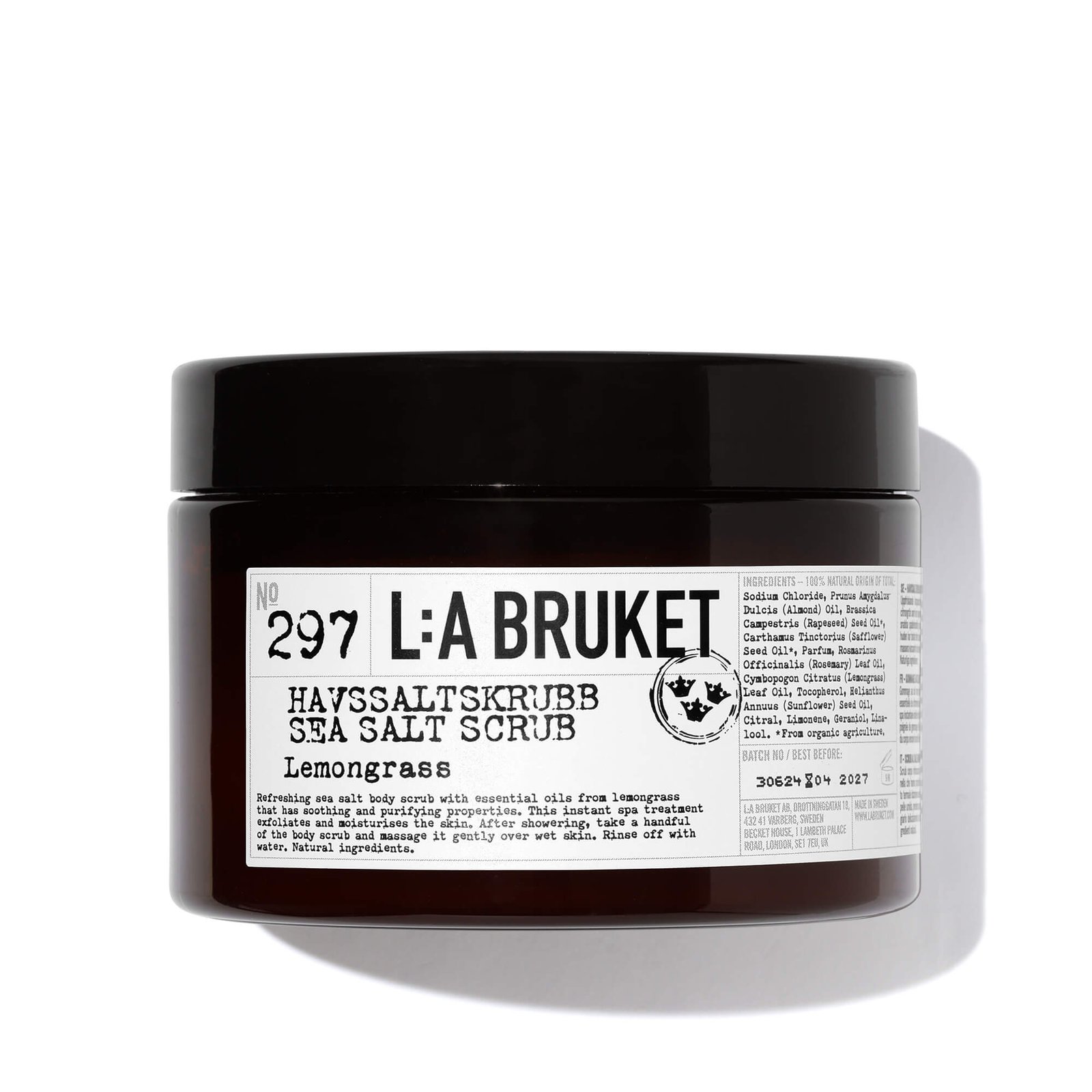 This natural scrub, with sea salt and the fragrance of Lemongrass and Rosemary, exfoliates and deeply nourishes the skin.